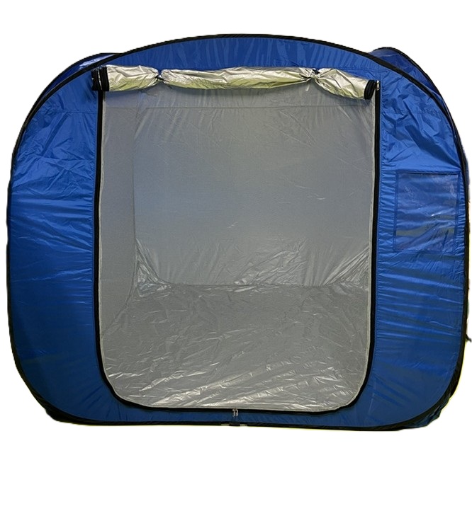 この避難所用テント式パーテーションはスチールスプリング製一体構造のフレームに防炎加工が施されたポリエステル生地。ワンタッチで設置可能。工具は不要です。