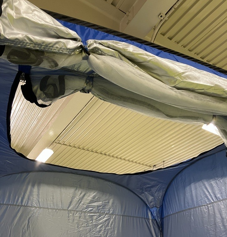 避難所では、他人の目線が気になる場面が多々あります。高さは180cm。広さも十分なサイズで、着替えや休憩などの場面でも安心して使える設計になっています。これは以前、三田市への納品をご紹介した災害用簡易ベッドが入ります。さらに、天井部分は開閉式になっており、必要に応じて通気性を確保したり、上部からの視線を遮ったりと、状況に応じた使い分けが可能です。