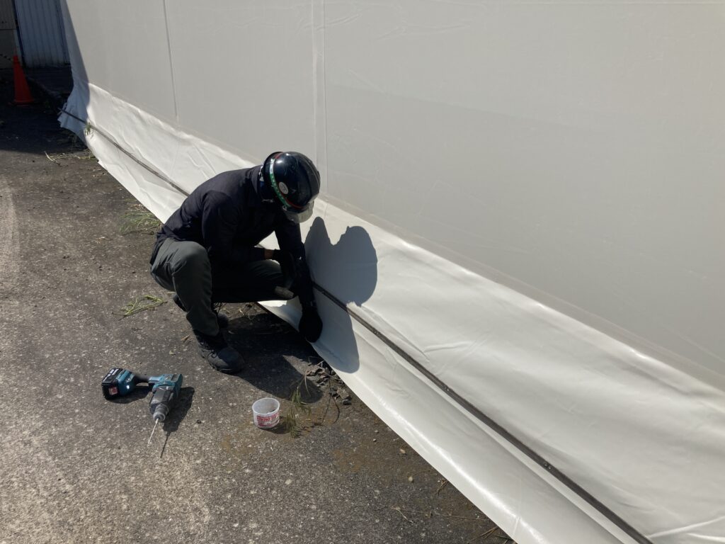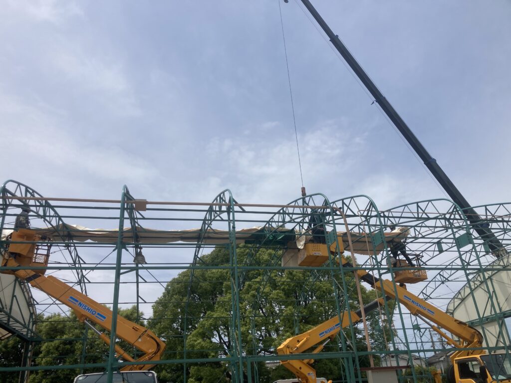 令和6年4月16日に発生した雹被害により破れてしまったテント倉庫の張替え工事を行いました。
