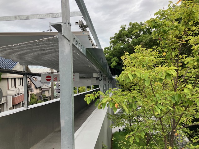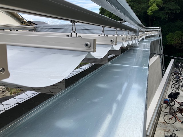 雨水を手摺より外側に流れるように、テント下に水切りプレートを20m分設置致しました。