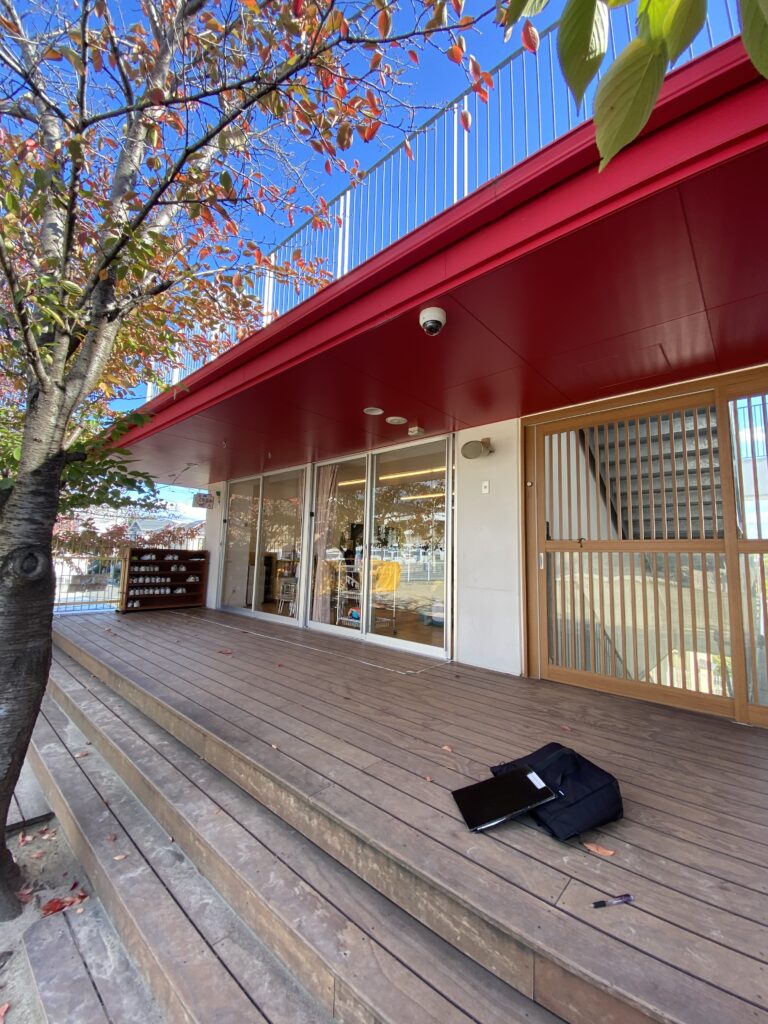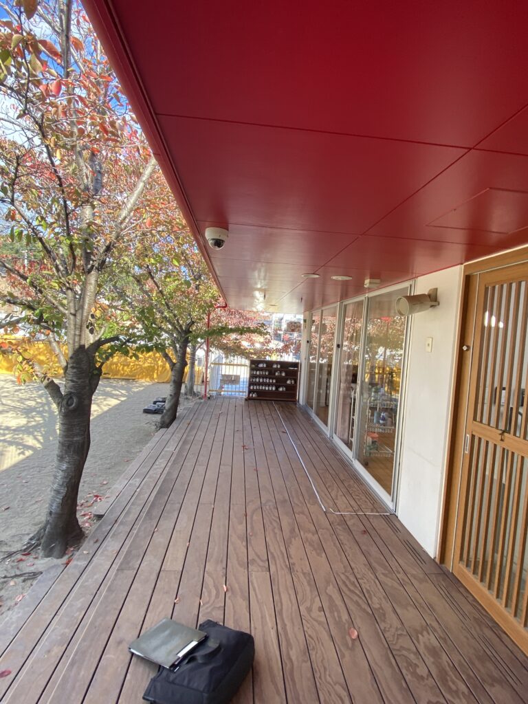 教室から直接園庭に飛び出せる設計の廊下です。