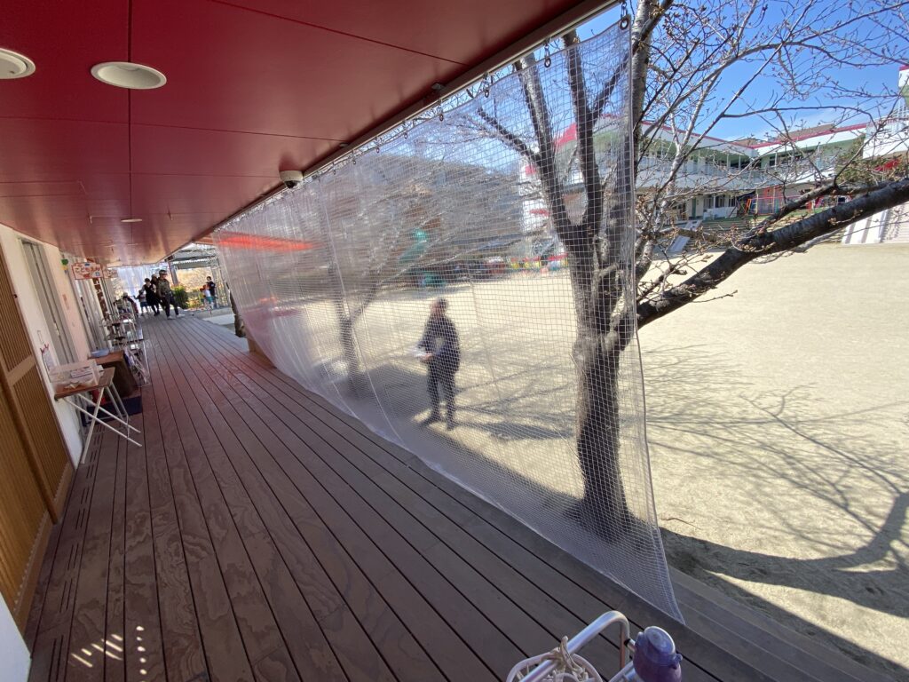 幼稚園廊下 吹降り防止カーテン新設