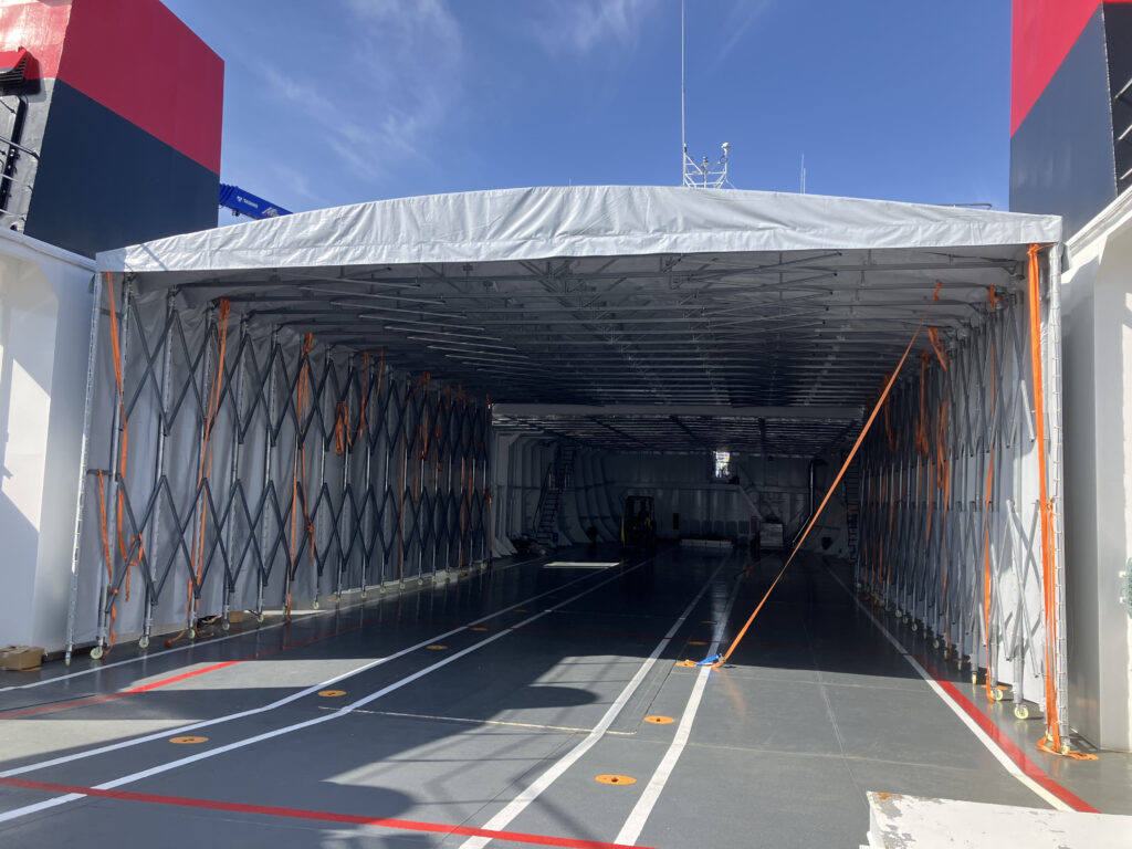 積み荷を雨風から守る為の船上オーニングのような役割のテントでした。