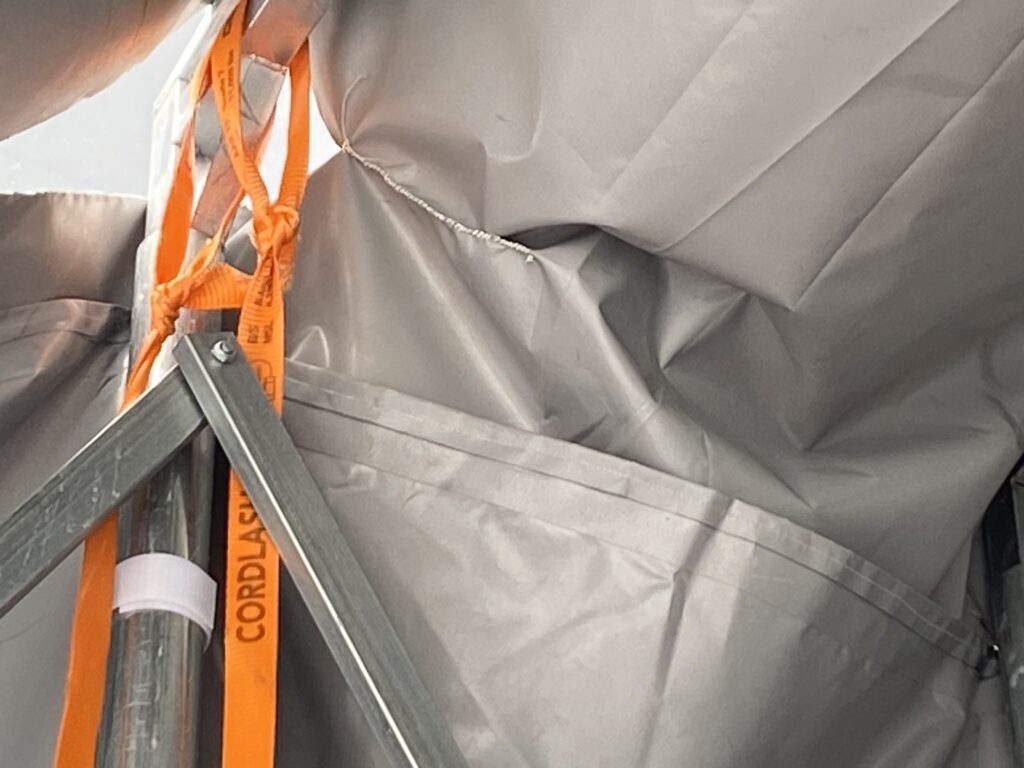 鉄骨枠に対して生地が大きく、壁も天井も生地が余り、たわみが生まれています。